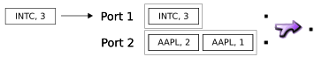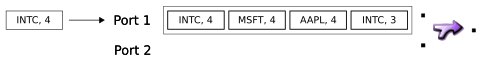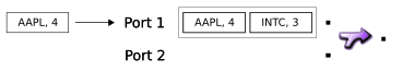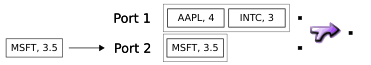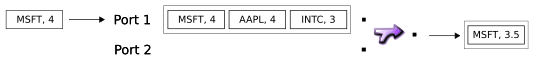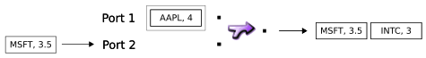 When the next tuple arrives on the first stream, the same condition applies as in Example 1: the two tuples on the second port have earlier timestamps. However, no merge occurs this time, because now we want to group tuples by symbol. None of the tuples buffered on the second port matches the symbol of the incoming tuple, so the new tuple is buffered while the Merge operator waits for more input.