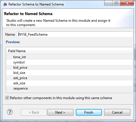 The checkbox for Refactor other components in this module using this same schema is selected by default. This directs StreamBase to locate other components in the current module that use a private schema with the same field names, data types, and field order as shown in the Preview section. If any such components are located, StreamBase converts them from using that private schema to using the schema you are currently promoting to named.