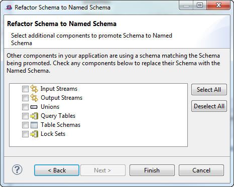 Use the second page of the dialog to narrow the list of other components to which you want the named schema applied. The second page shows a list of schema-bearing component categories. If there are any component candidates in the current module that use the same schema, they are shown in the list. Use the checkboxes to select the components to which you want the named schema applied.