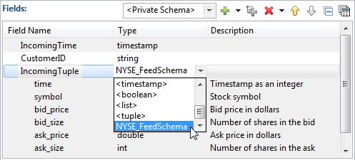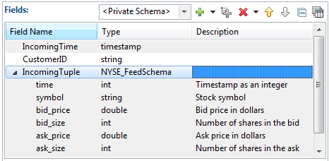 IncomingTuple, has the data type tuple, and its fields are defined as an instance of theNYSE_FeedSchemanamed schema.