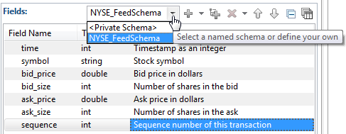 You can replace the entire schema of a component with the fields defined in a named schema. To do so, select the name of the named schema from the dropdown list at the top of the Fields grid. This pulls the field definitions of the named schema into the current Fields grid, replacing any private field definitions already there.