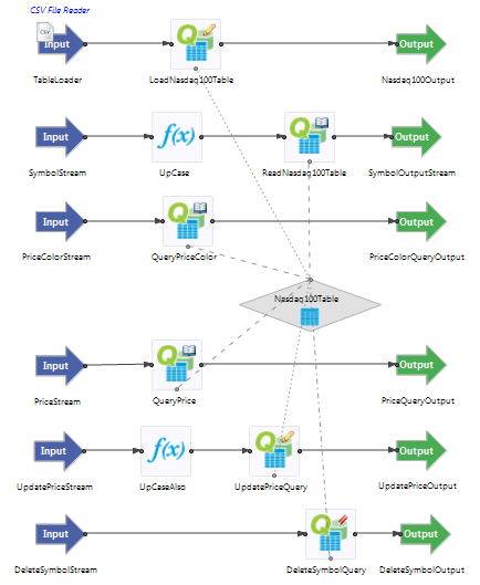 Notice that the Nasdaq100Table Query Table is referenced by six Query operators, two of which write into the table, three of which read from the table, and one that deletes rows in the table.