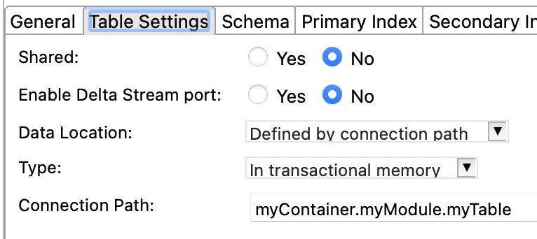 Either choose an existing table schema or define a private table schema for this table. The default setting enables you to define a schema in the grid below. You must also define your table's indexes using the Primary Index and Secondary Indexes tabs. Private schema definitions are local to this Query Table and to the containing module.