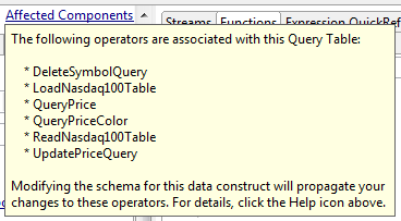 The following example shows an Affected Components pop-up window that shows the Query operators associated with the Nasdaq100Table Query Table in the sample application, which is a member of the operator sample group included in StreamBase.