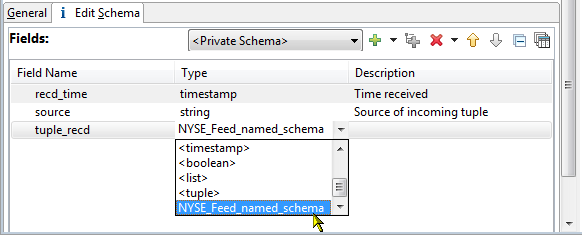 Private schema is StreamBase Studio's term for unnamed schemas. In Studio, you create a private schema in a component's Properties view by adding rows directly in the Fields grid of an Edit Schema tab. You also create a private schema when you add a row of type