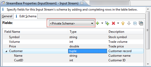 In StreamBase Studio, use private schemas for components in small EventFlow fragments, or for components with a different schema than other components in your fragment. Defining a private schema does not mean that the schema is restricted to the component for which it is defined. As with all schemas in StreamBase, private schemas are automatically inherited by all downstream components.