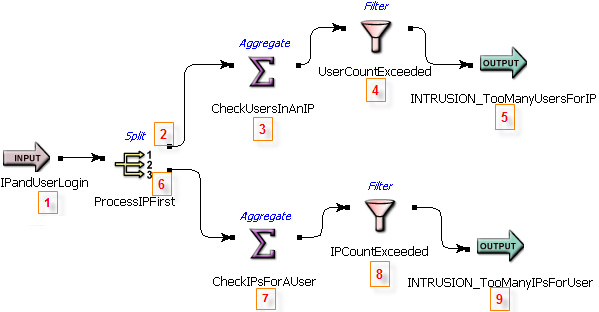 The diagram above has red numbers to indicate the processing order of each component. When the server runs this compiled application, it encounters steps 2 and 6 in the Split operator. The server executes in the order 2, 3, 4, and 5 before returning to step 6 and beyond.