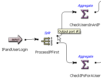 To easily view the output port numbers, make sure tooltips are enabled, as described in Authoring Panel. This is especially helpful when you have many output ports and want to be sure you are connecting the arcs as intended. The following illustration shows the cursor is hovering over the top output port on the right side of the Split operator: