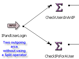 However, in this case, the order in which tuples proceed out the multiple arcs is not known and is not guaranteed. By using a Split operator, you can obtain guaranteed processing order.