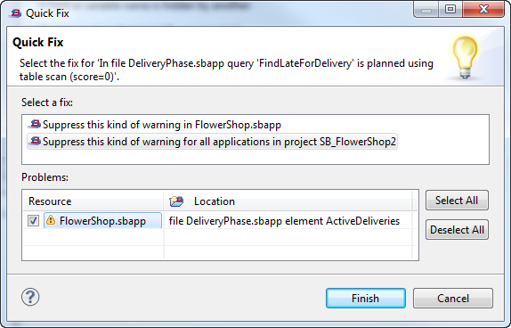 To use this feature, select a warning message in the Problems view, right-click, and select Quick Fix from the context menu. This brings up the Quick Fix dialog like the following example:
