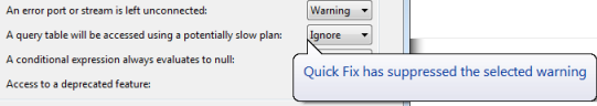 In this example, two solutions are offered: to suppress warnings of this type in the current module, or suppress them in all modules in the current project. Select a fix type and click . Studio opens the Preferences panel or EventFlow Editor tab corresponding to the selected fix, and changes the corresponding warning type to Ignore: