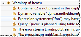 StreamBase supports warning messages issued during typechecking in addition to the typecheck error messages. Warnings provide guidance on settings that may cause complications, but do not prevent the EventFlow module from passing typechecking, or from compiling and running. For example, you might see a warning for the following situations: