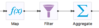 On the Studio canvas, tuples flow left to right. In general, a component such as Aggregate in the image below that is on the right side of a component such as Filter is said to be downstream from the Filter. A component such as Map that is on the left side of the Filter component is said to be upstream from the Filter.