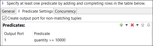 5. Select the Predicate Settings tab. Notice that a row in the Predicates table exists for output port 1, with the predicate expression true. Edit this expression in the Predicate column, and specify: