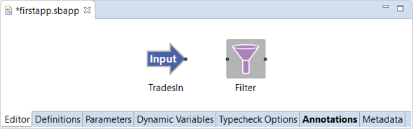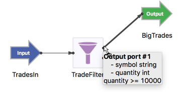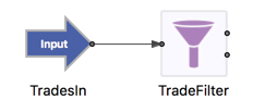 On the canvas, click and hold the output port at the tip of the TradesIn arrow and drag the resulting arc to the input port on TradeFilter.