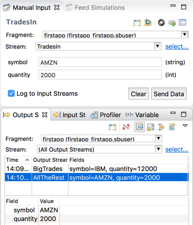 The Manual Input view provides a simple way to send individual tuples to a running fragment's Input Streams. You can then observe the results in the Output Streams view.