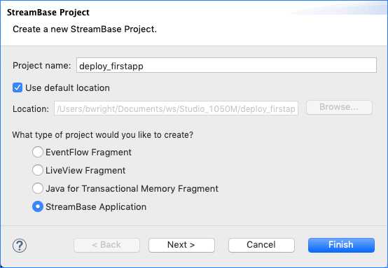 In the dialog's first panel, enter a name for the project, and select StreamBase Application as the project type. It is a best practice to choose a name for this project that starts with "deploy" to distinguish it from EventFlow and LiveView fragment projects.