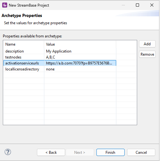 activationserviceurlsproperty is set as an archetype property in this window, the correspondingactivation.service.urlsvalue in the project'spom.xmlis updated accordingly.When the