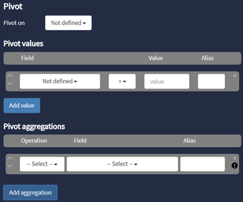 To add a pivot modifier to your query, select a table column on which to pivot, from the dropdown list. Continue to refine the pivot query by clicking respective buttons to add pivot values and pivot aggregations.