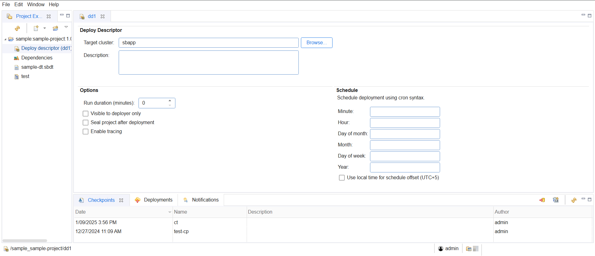 The root project being deployed must contain a Deploy Descriptor. The Deploy Descriptor specifies the Streaming cluster that the project will be deployed to. It also specifies whether the deployment should occur immediately or is to be executed in the future.