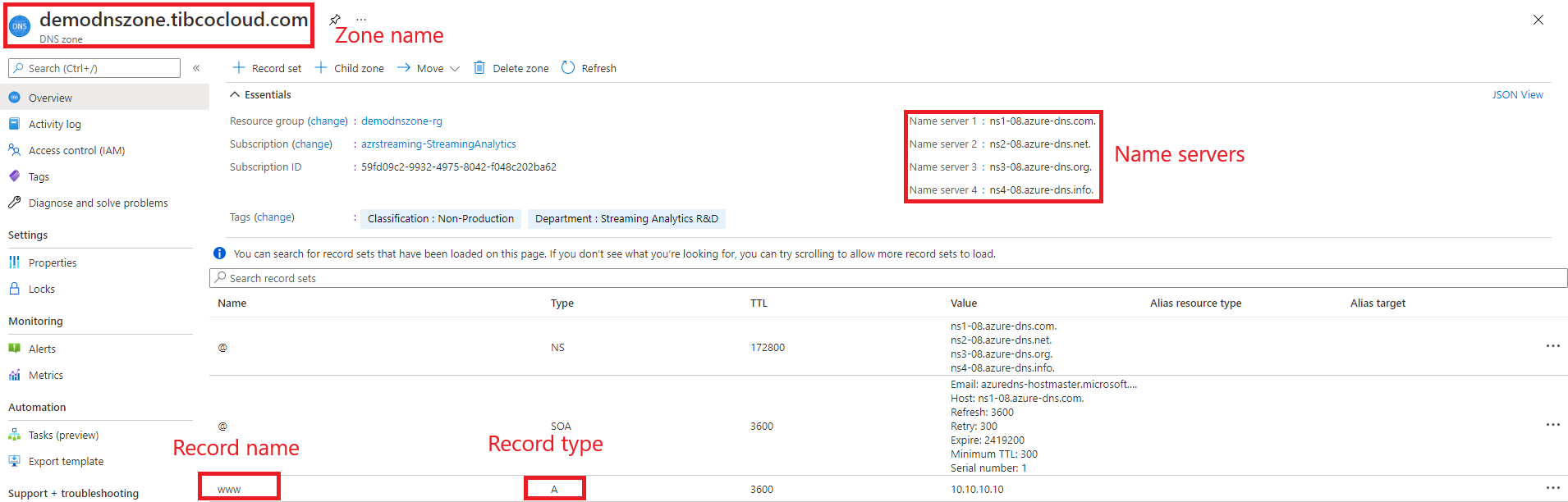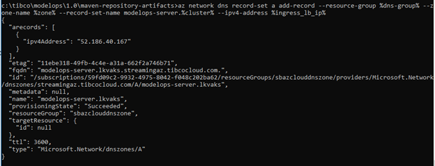 Assign to the variable name DNS_ZONE the DNS zone you want to use. If you have none yet, you can create one. TIBCO DNS Zone Example: streamingaz.tibcocloud.com In this example streamingaz.tibcocloud.com is subzone of the parent domain tibcocloud.com.