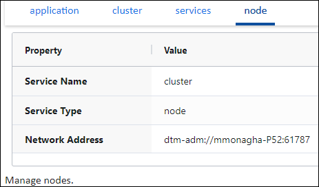 On the right pane notice the following tabs, each a child entity of the cluster managed entity: