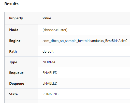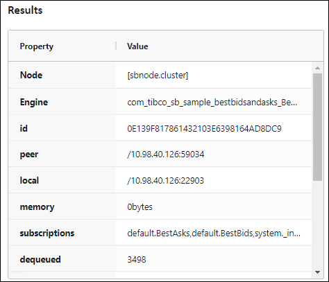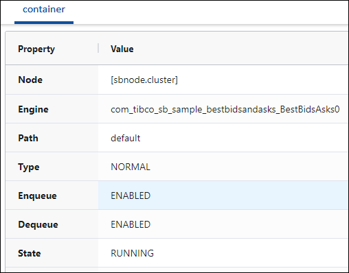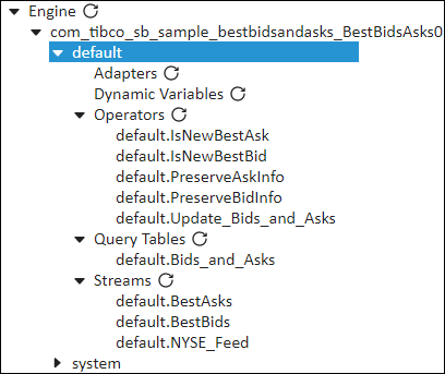 Containers displayed in the Cluster view feature a variety of managed entities that vary by application per running node. Drill down as needed to explore configuration details and commands you can run there. The following example shows the left pane's configurable entities for the running Best Bids and Asks sample: