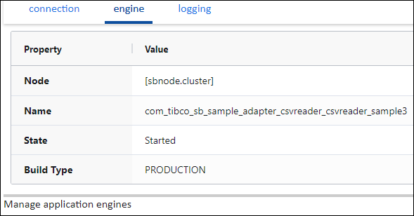 The Engine managed entity displays the top-level engine information for the selected application. Below the top-level are