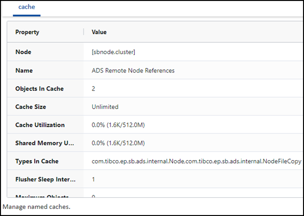 Each tab displays the properties and values applicable to the selected configuration object. One child entity is available for Named Caches: