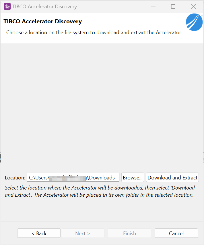 A window showing Choose a location on the file system appears. Browse the location where the Accelerator will be downloaded, then select Download and Extract.