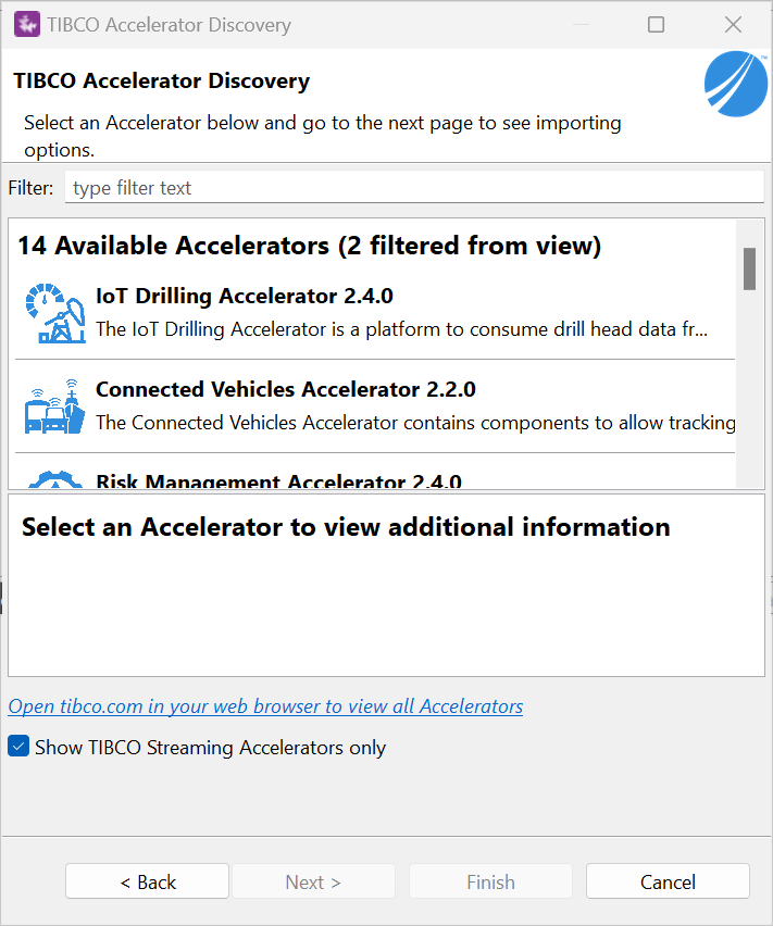TIBCO Accelerator Discovery allows you to browse available Accelerators from TIBCO Community. Using the wizard, you can view information about all Accelerators, download them to your computer, and import them into your Studio workspace. This plugin works with any Eclipse-based product, but only shows Accelerators that require the current product by default. This can be toggled in the wizard to show all Accelerators.