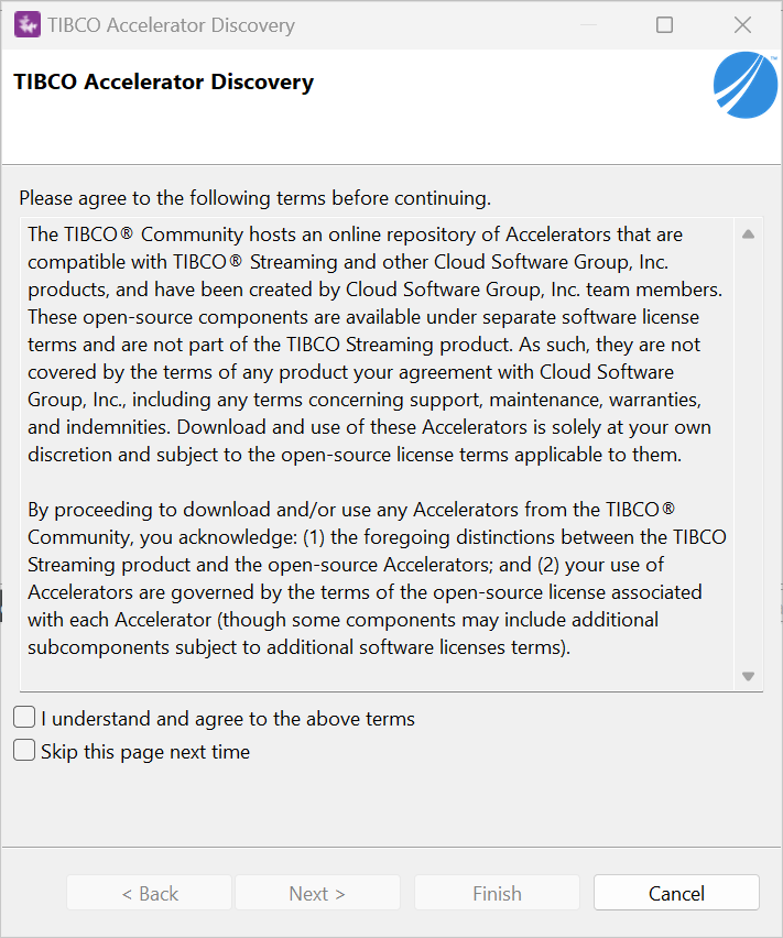 To download Accelerators from Studio, select >from Studio's top-level menu. A initial license page like the following appears.