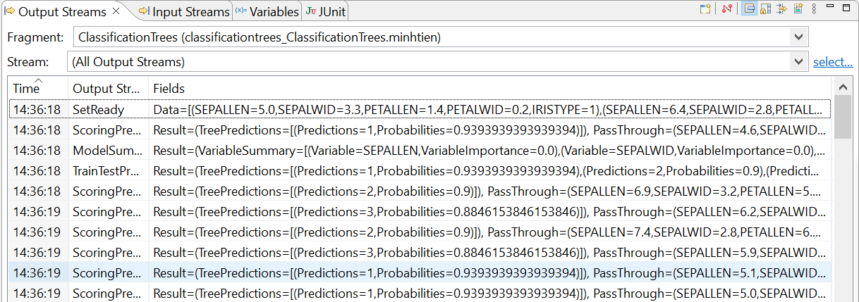 The provided StreamBase modules for these operators use the IRIS Flower data - irisdat.csv. SEPALLEN, SEPALLWID, PETALLEN, PETALWID features are selected as predictors. IRISTYPE is selected as the response. Data is fed into the Matrix operator to be collected and emitted every 100 rows. Once the matrix operator has collected the required number of rows of data, the SetReady output stream sets a dynamic variable indicating the Threshold condition has been met. The first N tuples are not scored because the operator is yet to be trained. This operator uses the collected data and options (from the provided schema) as inputs.