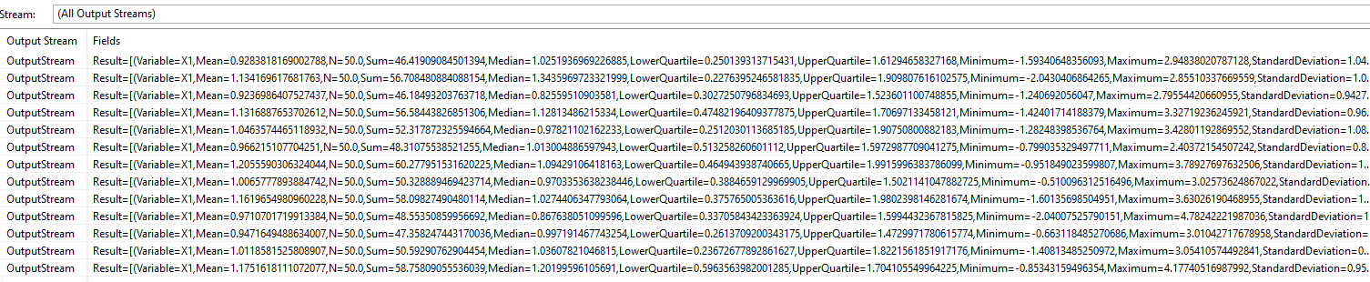 The Descriptive Statistic operator starts taking data from the feed simulation and emitting the results after 50 rows collected.