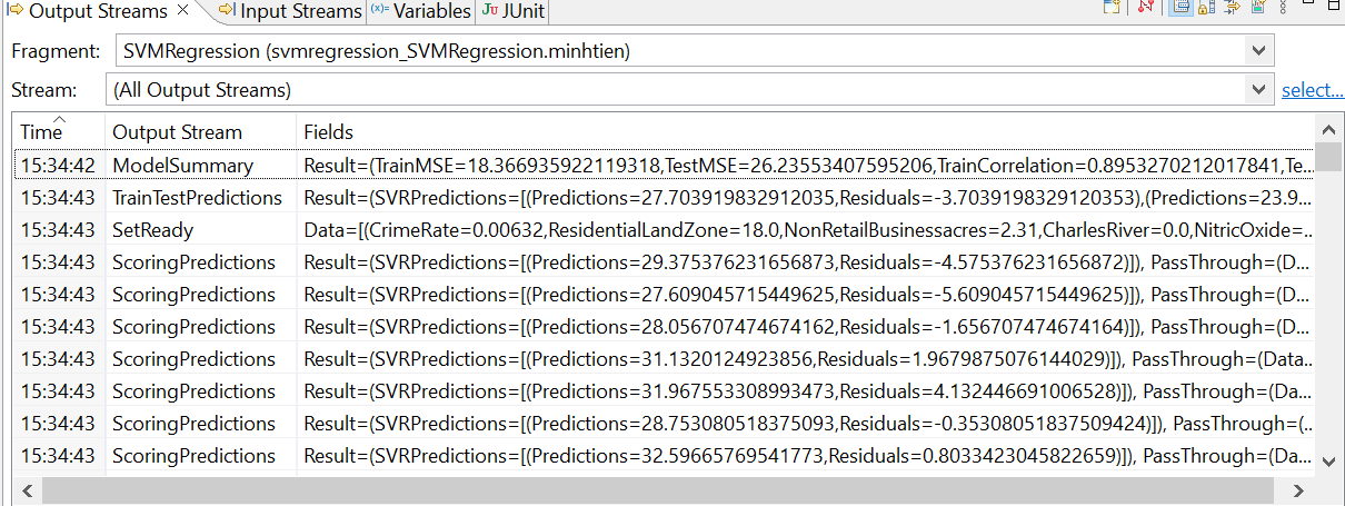 The Support Vector Machine Regression operator starts taking data from the feed simulation and emitting the results after 300 are rows collected.