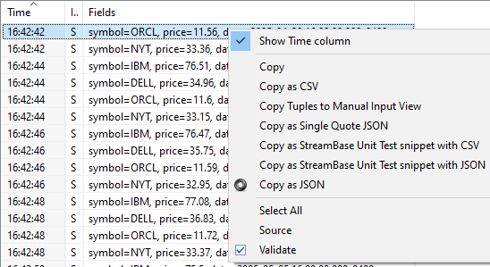 getEnqueuer().enqueue()call using the CSVTupleMaker:server.getEnqueuer("InputStream1").enqueue( CSVTupleMaker.MAKER, "IBM,75.91,2005-04-28 16:00:00.000-0400" ); - Copy as StreamBase Unit Test snippet with JSON