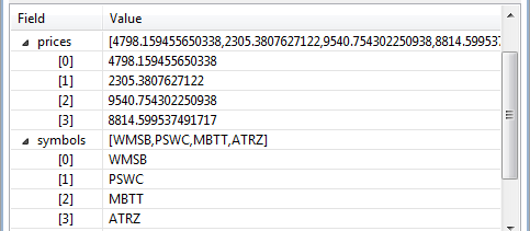 Fields with the list data type are shown with their contents in array form on a single line with an open arrowhead to its left. Click the arrowhead to see the individual elements of the list field, one per line: