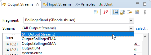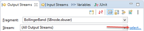 new Expecter(server.getDequeuer("OutputIBM")).expect( JSONSingleQuotesTupleMaker.MAKER, "{'symbol':'IBM','UpperBand':94.6431225476753,'MiddleBand':81.38050000000001, 'LowerBand':68.11787745232472,'price':75.91,'BandWidth':0.32594104355896786, 'PercentB':0.29376250887276817,'date':'2005-04-28 16:00:00.000-0400'}" );In the Input Streams view: