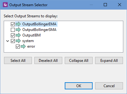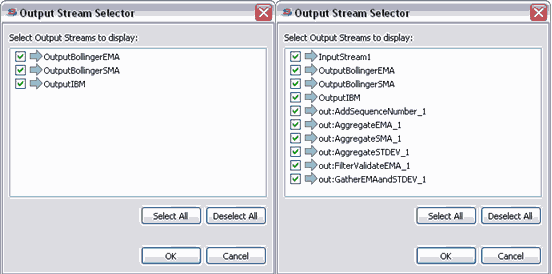 The following illustration shows the Output Stream Selector dialog for two cases of running the Bollinger Band sample installed with Streaming.