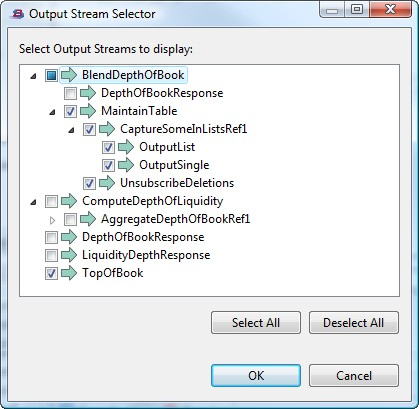 With intermediate stream dequeuing enabled, the Output Stream Selector dialog shows a larger list of streams whose output you can monitor.