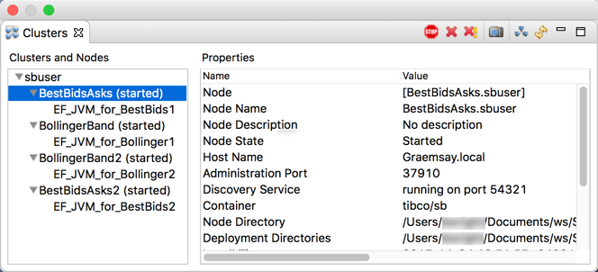 The Clusters view provides a display of the nodes that StreamBase® Studio installs and starts when running EventFlow and LiveView fragments.