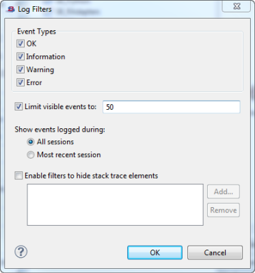 You can filter the view to show events of a particular type or session, or limit the number of entries in the view. To filter the current view, click the down-pointing arrowhead on the right of the Error Log view's toolbar to show the view's drop-down menu (there is no context menu equivalent). Select from the dropdown menu to show the Log Filters dialog.