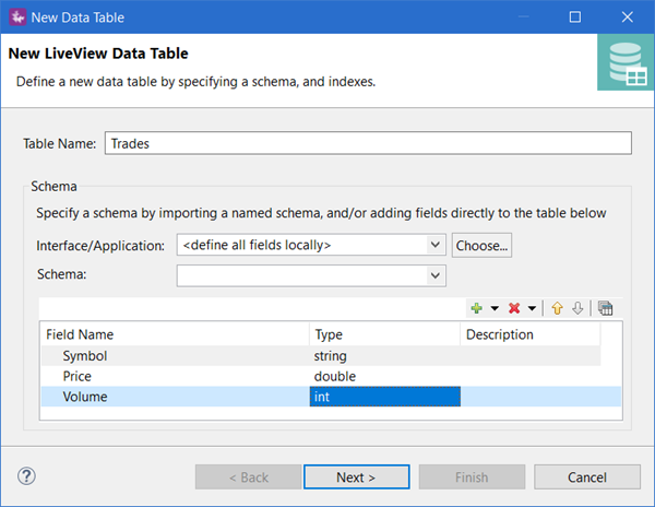 The New LiveView Data Table wizard is the first wizard you encounter when creating a new LiveView project.