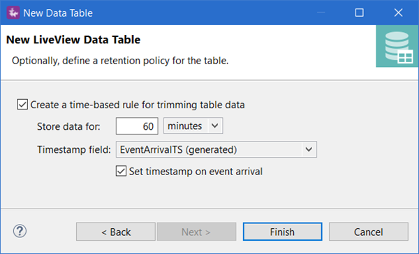 Use the third panel to define how long table rows should be retained. See Retention Policy for more information.
