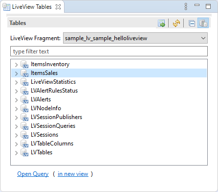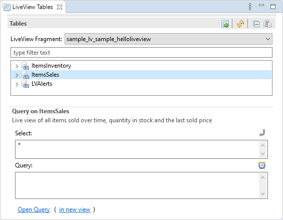 Clicking Open Query opens the Query view to a position adjacent to the Tables view, if it is not already opened. Clicking in new view opens a query for the selected table in another separate Query view. For more about querying LiveView tables, see Querying Your Data.