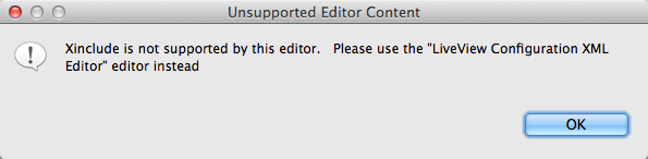 When you open an lvconf file that Xincludes another XML file, Studio shows the following warning message. When you click , Studio opens the file in the text-based validating XML editor, and marks the file to open again in that editor the next time you open it.