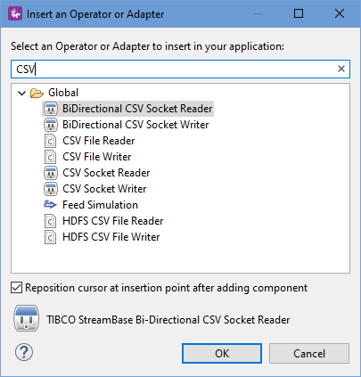 The Insert an Operator or Adapter dialog can also be used efficiently with keystrokes only. For example, to insert a CSV File Reader adapter icon, with an