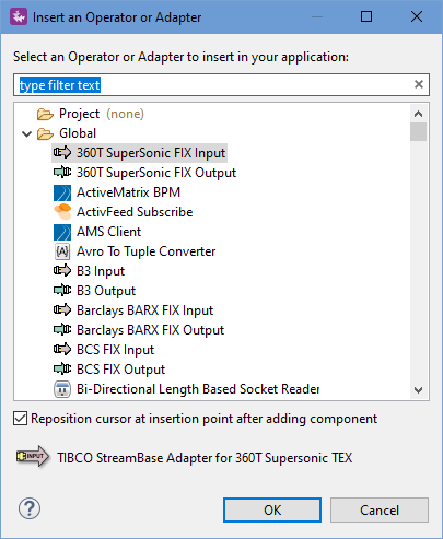 The Reposition cursor at insertion point option is selected by default. This allows you to immediately click to select the newly dropped adapter and show its Properties view. If you are adding several adapters with different search strings, unselect this option so that the cursor remains in the dialog.