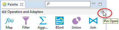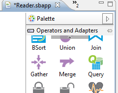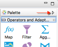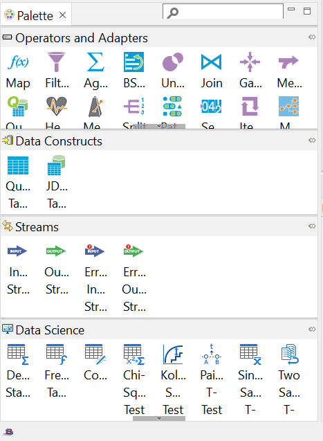 The Palette view includes a search field in its title bar where you can narrow the display in the view by specifying a few letters of the name of an operator, stream, or data construct of interest. This works best when you pin open all three drawers of the view, to see the effects of the search in all drawers at once.