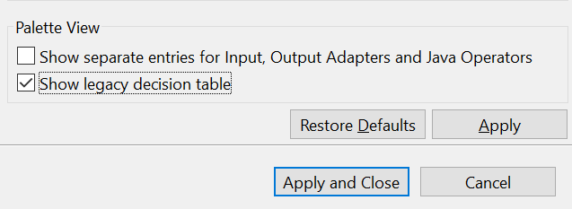 The Legacy Decision Table operator icon is not included in the Palette view by default. To show this operator icon in Palette view, open Studio Preferences and its > panel. Check Show legacy decision table option, select Apply and Close.